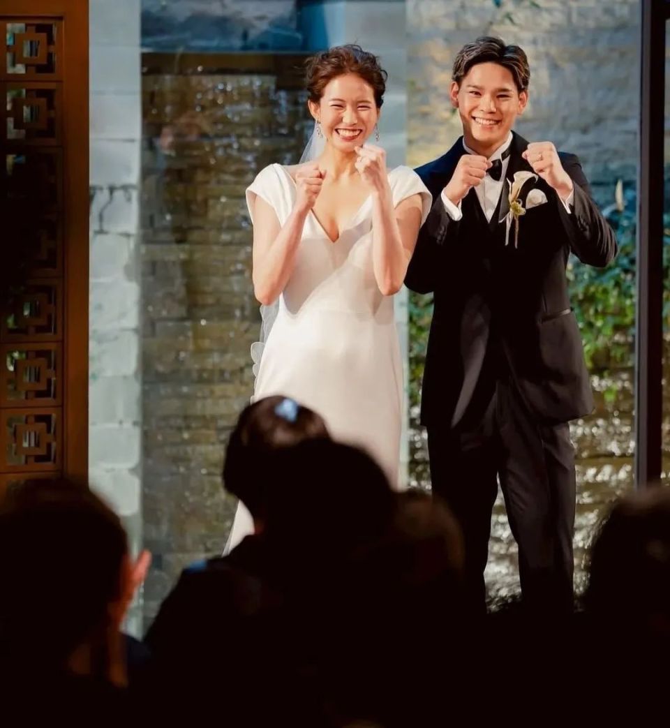 进入婚礼仪式阶段,古贺换上一袭深V设计的纯白礼服,头戴长纱,造型简洁却极具高级感,她与西田站在宾客面前,双手握拳摆出“加油”姿势,满脸喜悦,现场掌声与欢笑不断,这是属于他们的荣耀时刻,也是一场属于运动员的欢乐庆典。